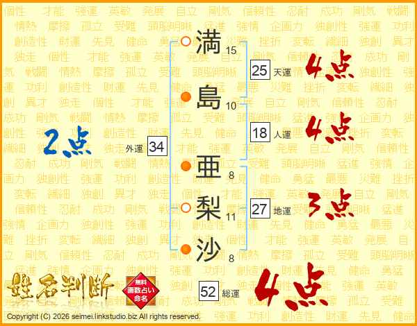 満(15画)島(10画) 亜(8画)梨(11画)沙(8画)