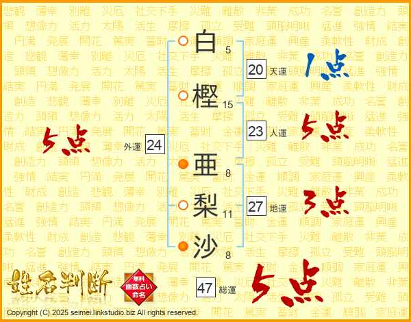 白樫亜梨沙さんの総運は47画の5点!