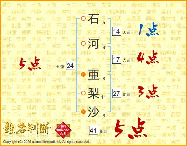 石(5画)河(9画) 亜(8画)梨(11画)沙(8画)