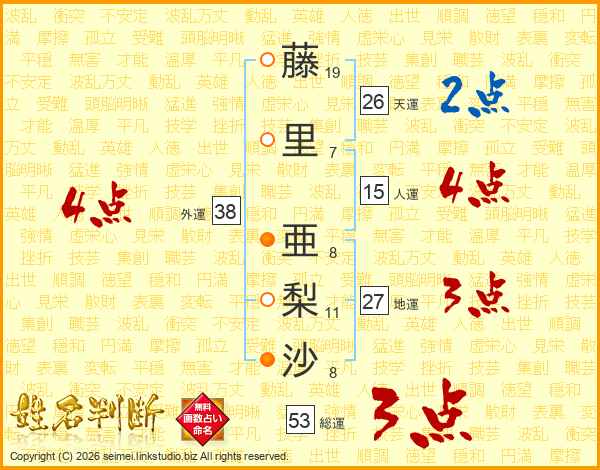 藤里亜梨沙さんの外運は38画の4点!