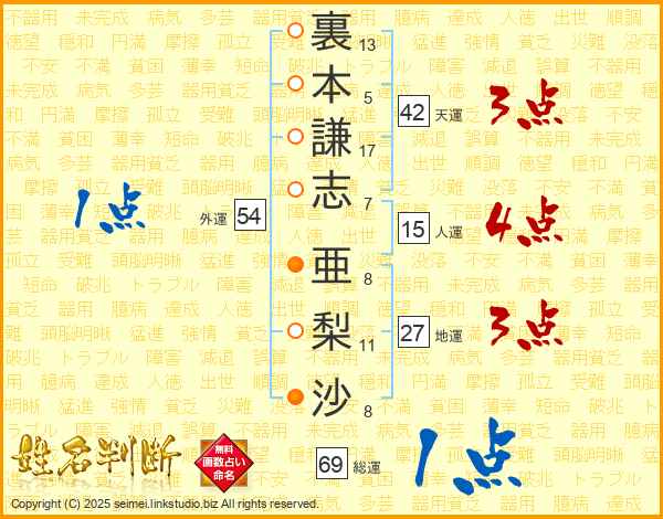 裏(13画)本(5画)謙(17画)志(7画) 亜(8画)梨(11画)沙(8画)