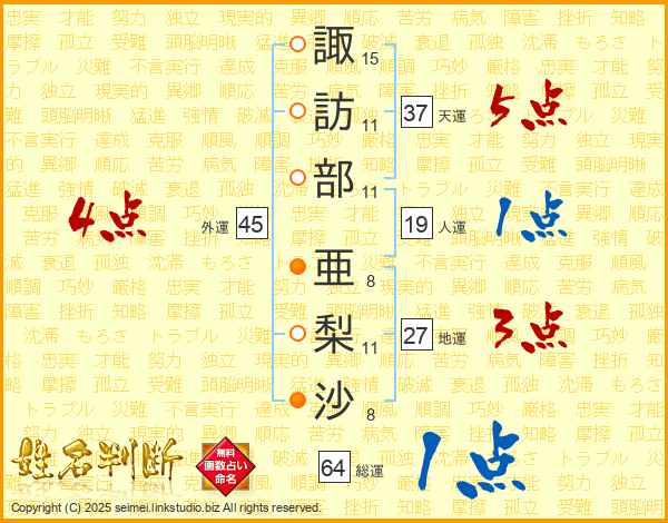 諏(15画)訪(11画)部(11画) 亜(8画)梨(11画)沙(8画)