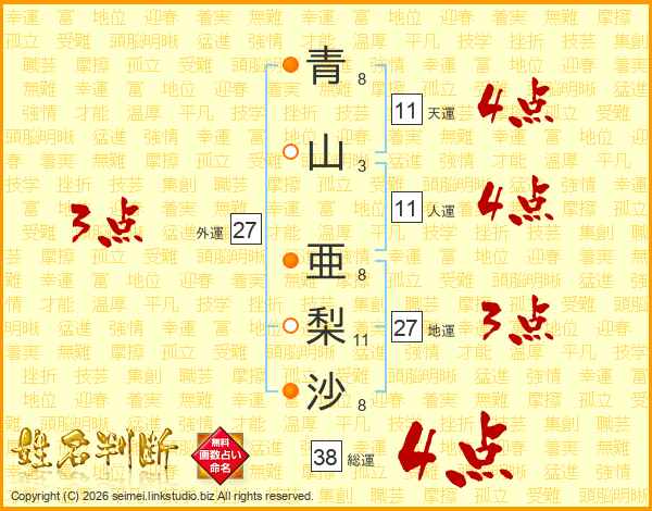 青(8画)山(3画) 亜(8画)梨(11画)沙(8画)
