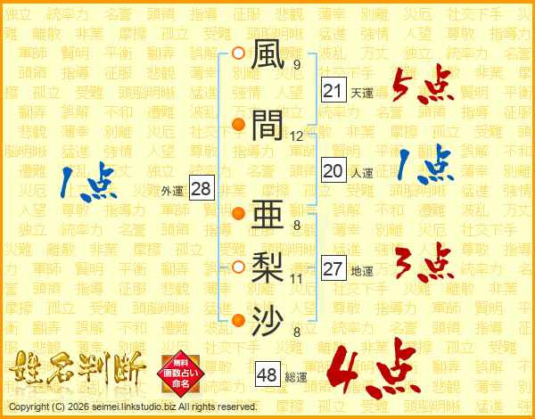 風(9画)間(12画) 亜(8画)梨(11画)沙(8画)