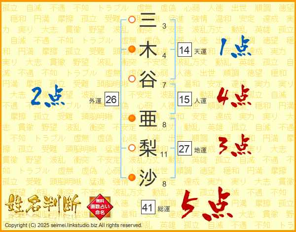 三(3画)木(4画)谷(7画) 亜(8画)梨(11画)沙(8画)