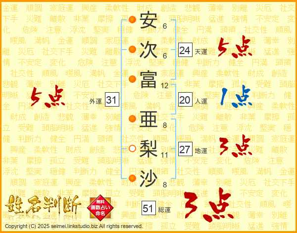 安(6画)次(6画)富(12画) 亜(8画)梨(11画)沙(8画)