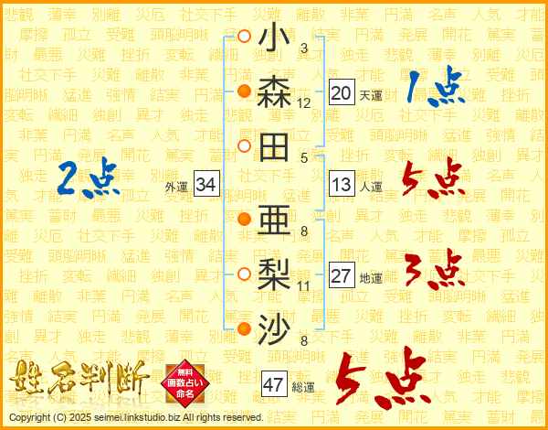 小(3画)森(12画)田(5画) 亜(8画)梨(11画)沙(8画)