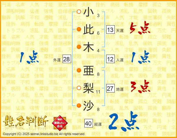 小(3画)此(6画)木(4画)  亜(8画)梨(11画)沙(8画)