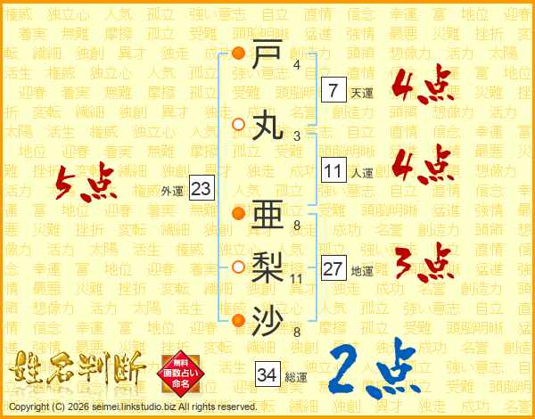 戸(4画)丸(3画) 亜(8画)梨(11画)沙(8画)