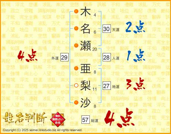 木(4画)名(6画)瀬(20画) 亜(8画)梨(11画)沙(8画)