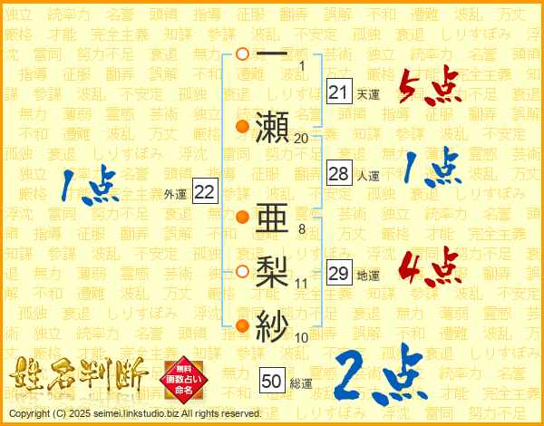 一(1画)瀬(20画) 亜(8画)梨(11画)紗(10画)