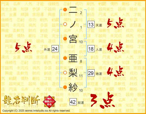 二ノ宮亜梨紗さんの外運は24画の5点!