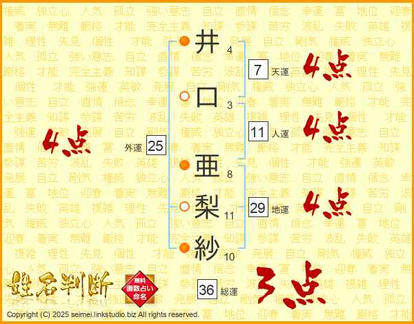 井(4画)口(3画) 亜(8画)梨(11画)紗(10画)
