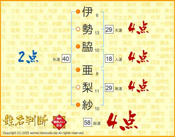 伊勢脇亜梨紗さんの総運は58画の4点!