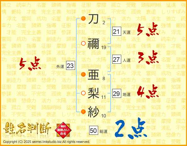 刀(2画)禰(19画) 亜(8画)梨(11画)紗(10画)