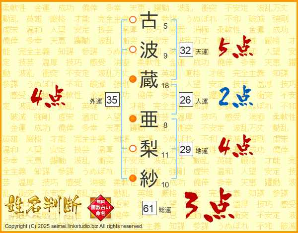 古(5画)波(9画)蔵(18画) 亜(8画)梨(11画)紗(10画)