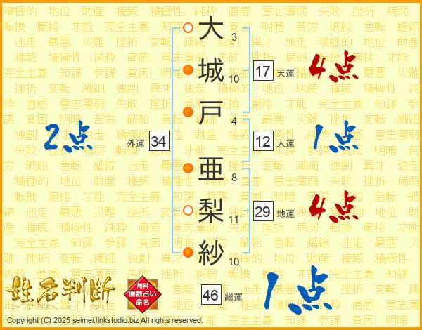 大(3画)城(10画)戸(4画) 亜(8画)梨(11画)紗(10画)