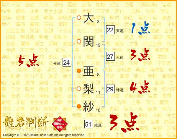 大(3画)関(19画) 亜(8画)梨(11画)紗(10画)