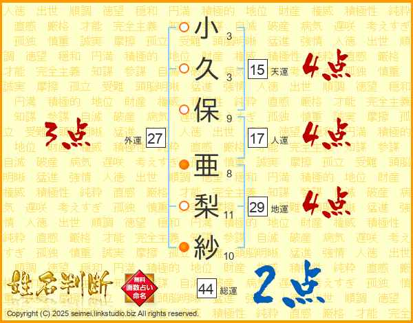 小(3画)久(3画)保(9画) 亜(8画)梨(11画)紗(10画)