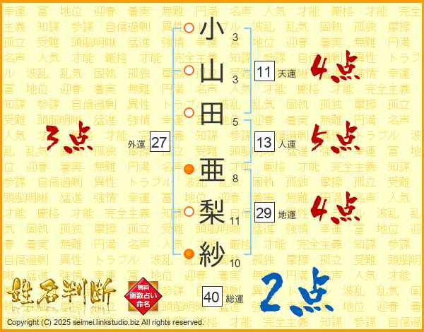 小(3画)山(3画)田(5画) 亜(8画)梨(11画)紗(10画)