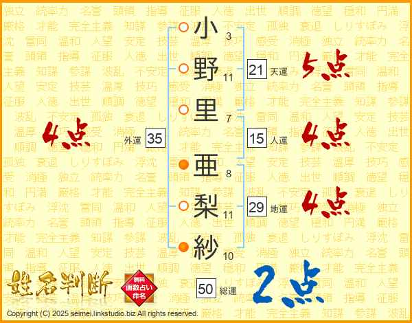 小(3画)野(11画)里(7画) 亜(8画)梨(11画)紗(10画)