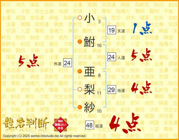 小(3画)鮒(16画) 亜(8画)梨(11画)紗(10画)