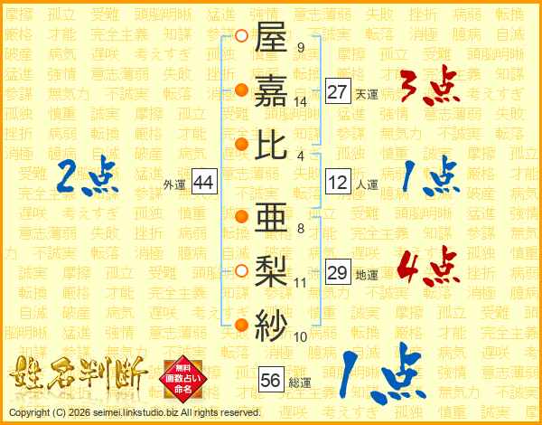 屋嘉比亜梨紗さんの外運は44画の2点!