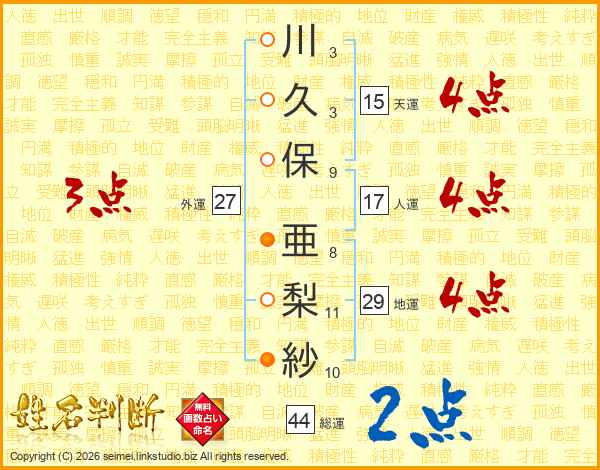 川(3画)久(3画)保(9画) 亜(8画)梨(11画)紗(10画)