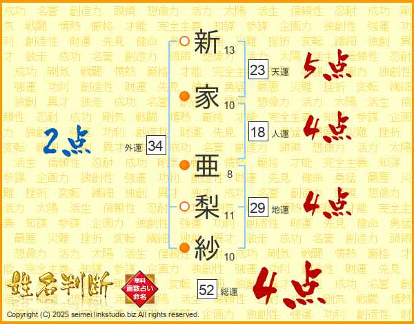 新(13画)家(10画) 亜(8画)梨(11画)紗(10画)