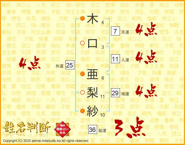 木(4画)口(3画) 亜(8画)梨(11画)紗(10画)