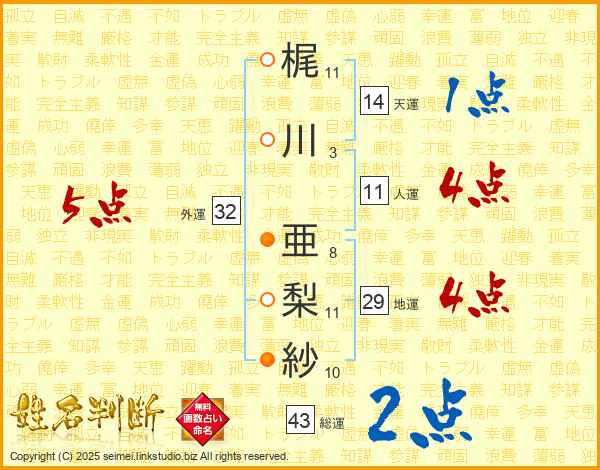 梶(11画)川(3画) 亜(8画)梨(11画)紗(10画)