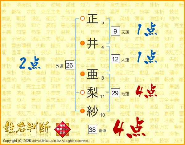 正(5画)井(4画) 亜(8画)梨(11画)紗(10画)