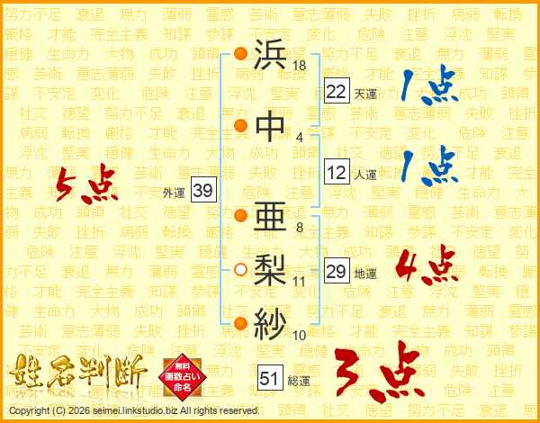 浜中亜梨紗さんの外運は39画の5点!