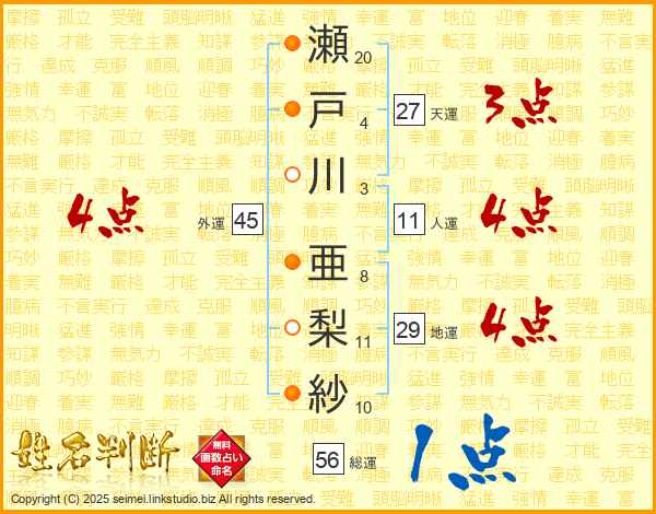瀬戸川亜梨紗さんの外運は45画の4点!