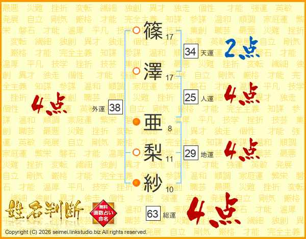 篠(17画)澤(17画) 亜(8画)梨(11画)紗(10画)