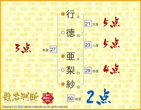 行(6画)徳(15画) 亜(8画)梨(11画)紗(10画)