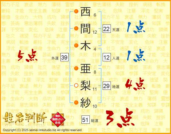 西間木亜梨紗さんの外運は39画の5点!