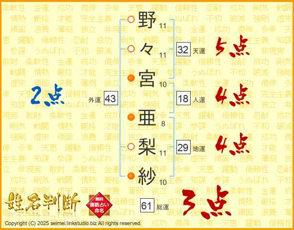 野(11画)々(11画)宮(10画) 亜(8画)梨(11画)紗(10画)