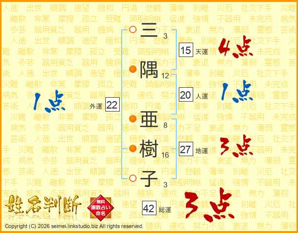 三(3画)隅(12画) 亜(8画)樹(16画)子(3画)