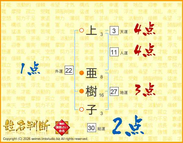 上(3画) 亜(8画)樹(16画)子(3画)
