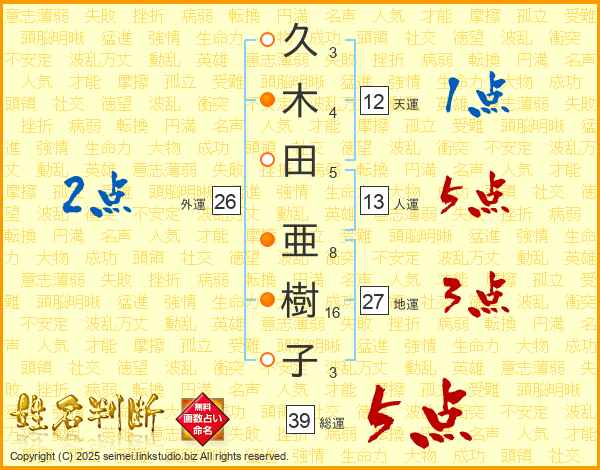 久木田亜樹子さんの総運は39画の5点!