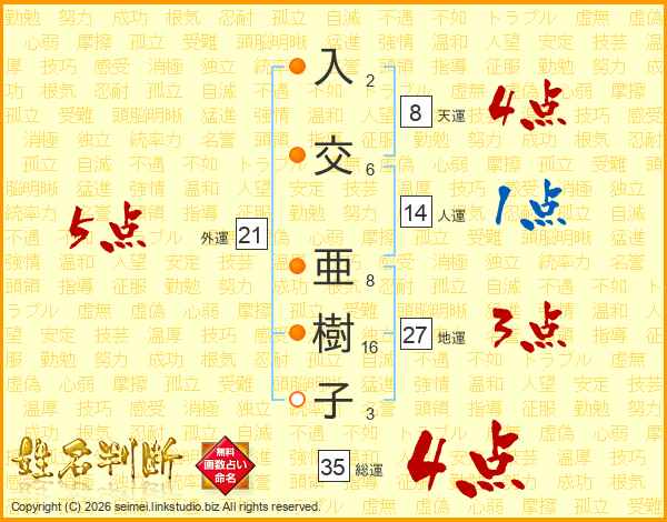 入(2画)交(6画) 亜(8画)樹(16画)子(3画)