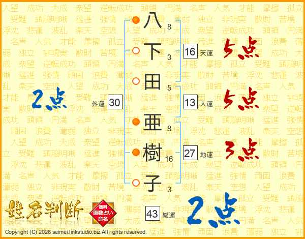 八下田亜樹子さんの総運は43画の2点!