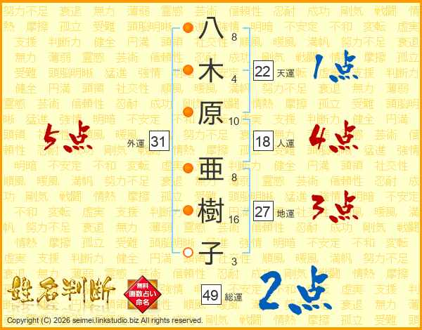 八(8画)木(4画)原(10画) 亜(8画)樹(16画)子(3画)