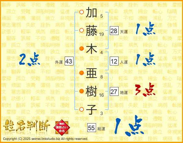 加(5画)藤(19画)木(4画) 亜(8画)樹(16画)子(3画)