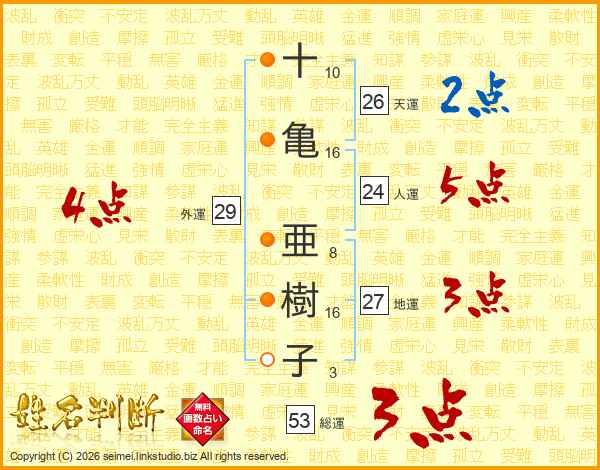 十(10画)亀(16画) 亜(8画)樹(16画)子(3画)
