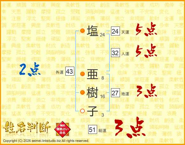 塩(24画) 亜(8画)樹(16画)子(3画)