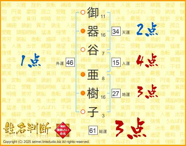 御(11画)器(16画)谷(7画) 亜(8画)樹(16画)子(3画)