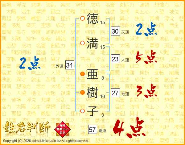 徳(15画)満(15画) 亜(8画)樹(16画)子(3画)