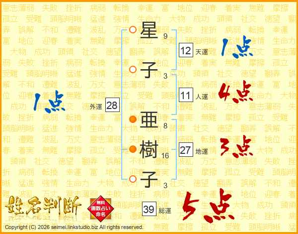 星(9画)子(3画) 亜(8画)樹(16画)子(3画)